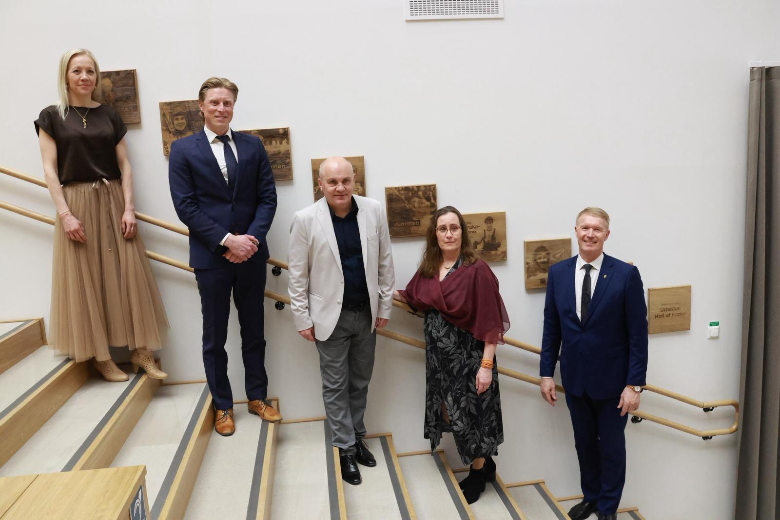 Sotkamon urheilulukion Hall of Fame urheilijoita: Kaisa Mäkäräinen, Jani Komulainen, Janne Vuorinen, Laila Finska-Linna ja Tapio Korjus